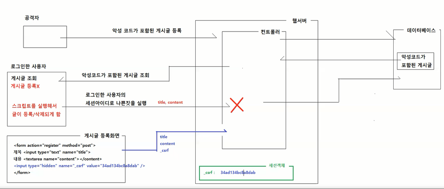 등록화면, 수정화면, 삭제화면의 경우, 스프링 시큐리티가 CSRF토큰이 있는지 확인하고 없으면 정상적인 요청이 아니라고 판단하고 요청을 거부하고, CSRF토큰이 있으면 사용자의 세션객체 안에 있는 CSRF토큰과 같은지 비교하고, 같으면 요청이 실행된다. Controller 실행 전에 실행된다.