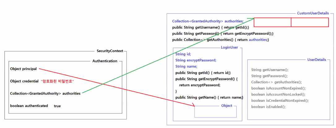 * spring security 태그 라이브러리를 이용하면 인증여부, 인증된 사용자의 정보, 인증된 사용자의 보유 권한을 JSP에서 이용할 수 있다.